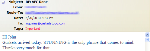 After receiving the gaskets the customer sent this message, which I was quite happy to receive!