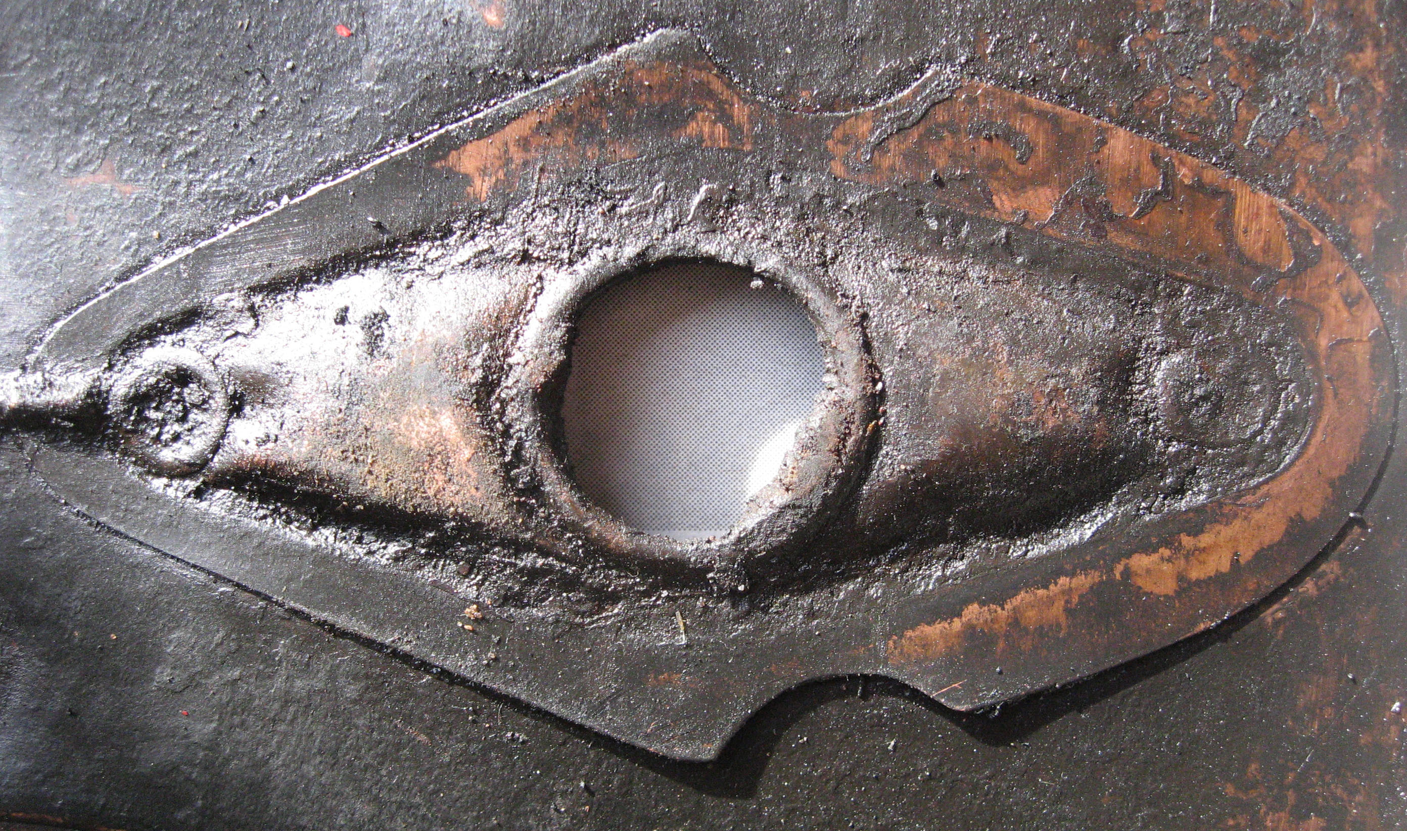 A peculiar feature of this gasket were restricter plates that were riveted into a dimond shaped cuotout and featured a bushed hole. I will paste a close up image of one of those below: